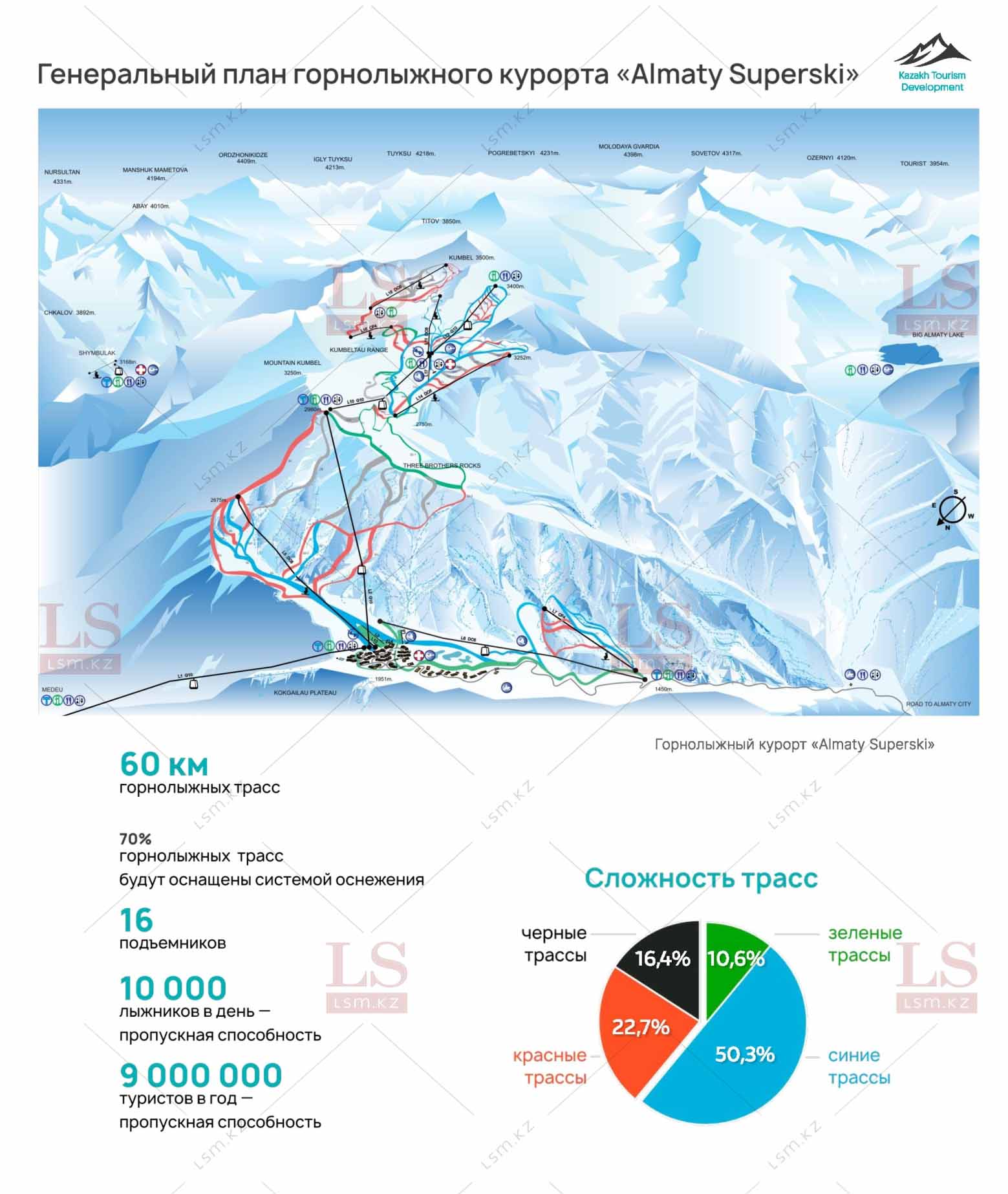 В статье сообщается, что «В Kazakh Tourism Development (KTD) рассказали LS подробности и предоставили схему трасс. По информации организации, запуск туристического комплекса планируется к концу 2028 – началу 2029 года. Согласно генплану курорта Almaty Superski (1 тыс. га), в урочище будет протянуто 60 км горнолыжных трасс, которые охватят пик Кумбель и вершину Три брата. 70% маршрутов будут оснащены системой оснежения. На территории будут функционировать 16 подъемников. Сложность трасс будет разделена на четыре вида сложности: синие (50,3%), зеленые (10,6%), красные (22,7%), черные (16,4%). Ожидается, что пропускная способность будет равна 10 тыс. лыжников в день и 9 млн туристов в год. Помимо этого, на курорте построят деревню из шале и гостиниц на 6,5 тыс. мест (20 га). Частных жилых домов и ЖК не будет. Канатную дорогу протянут по маршруту Медеу – Almaty Superski…»