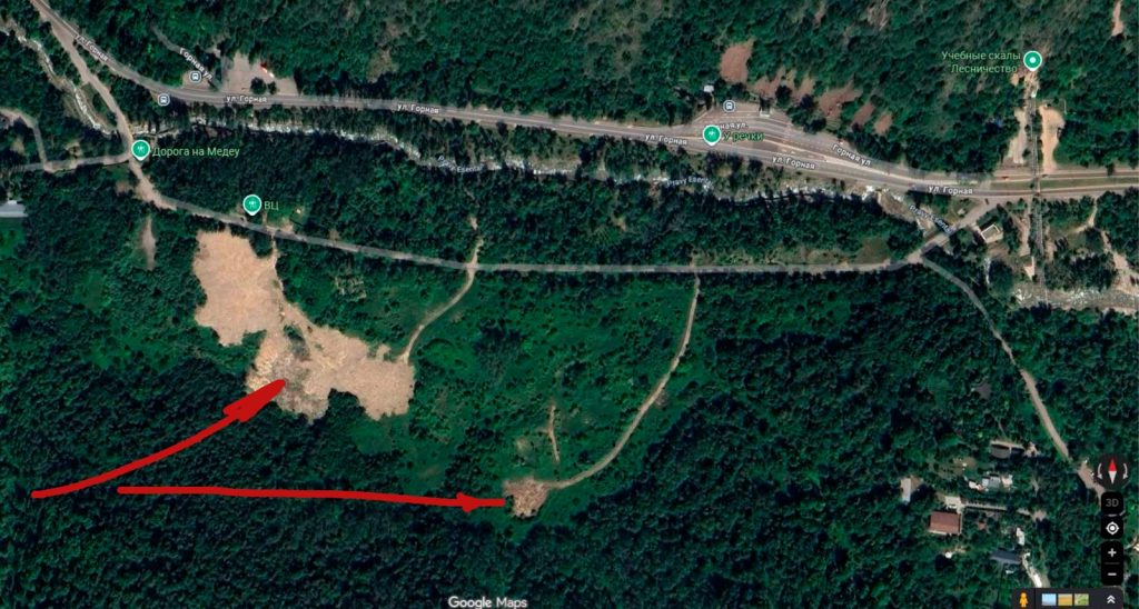 Одно из таких мест мы нашли и сообщили его координаты уполномоченным органам с требованием принять меры. Оно находится между парком «Медеу» и Иле-Алатауским национальным парком, именно там, где должна быть, с одной стороны, охранная зона парка, с другой – водоохранная зона Малой Алматинки. Как раз «на пороге дикой природы» (координаты: 43.17230155709635, 77.01726704516116; 43.171311, 77.019344).